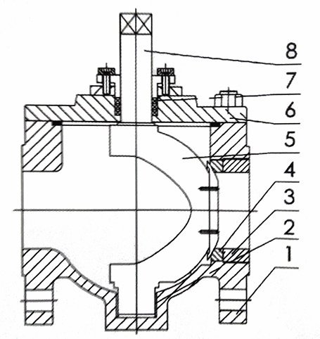 圖中數(shù)字注釋:1表示閥體,2表示壓緊圈。3表示軸套,4表示閥座,5表示球冠,6表示閥蓋,7表示填料,8表示偏心軸。