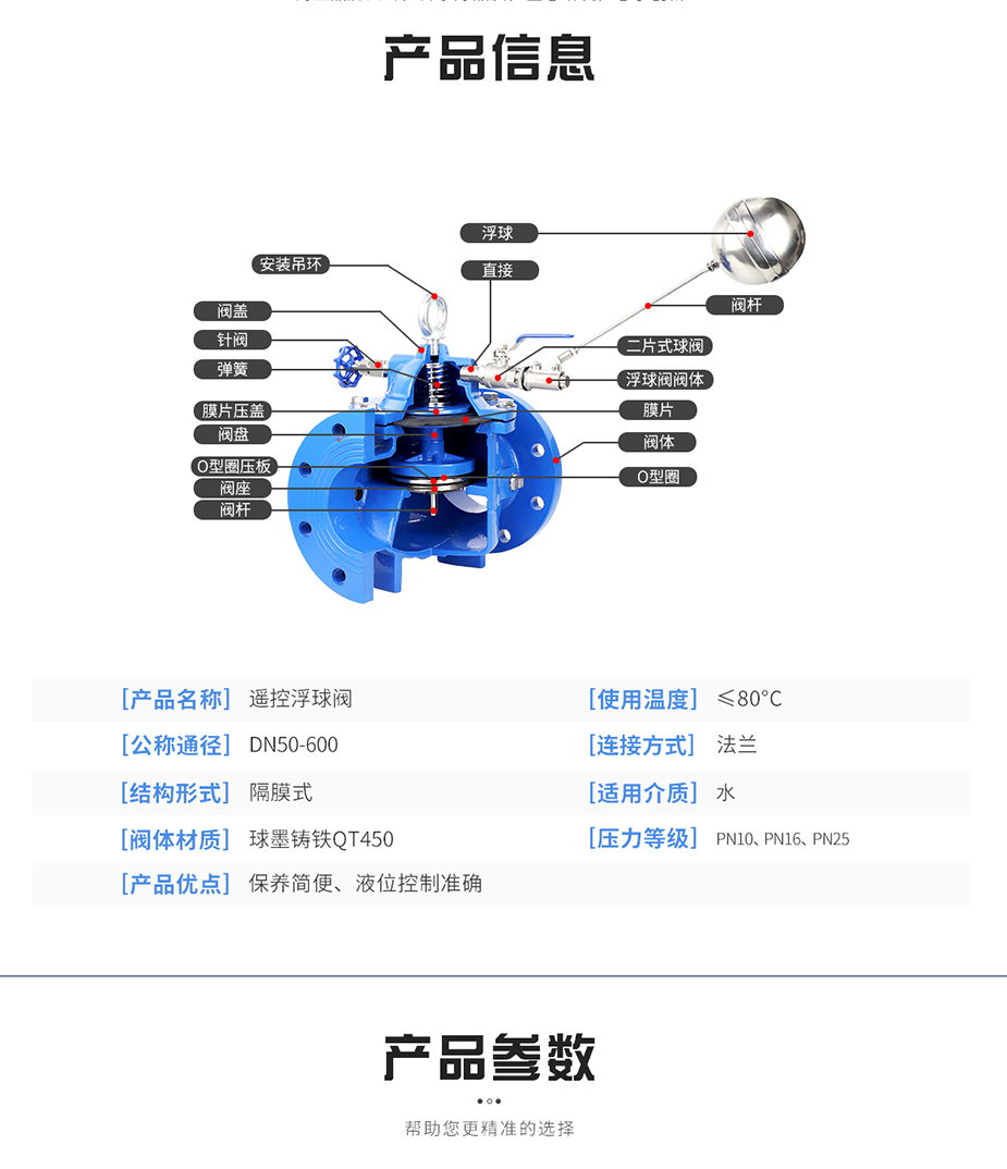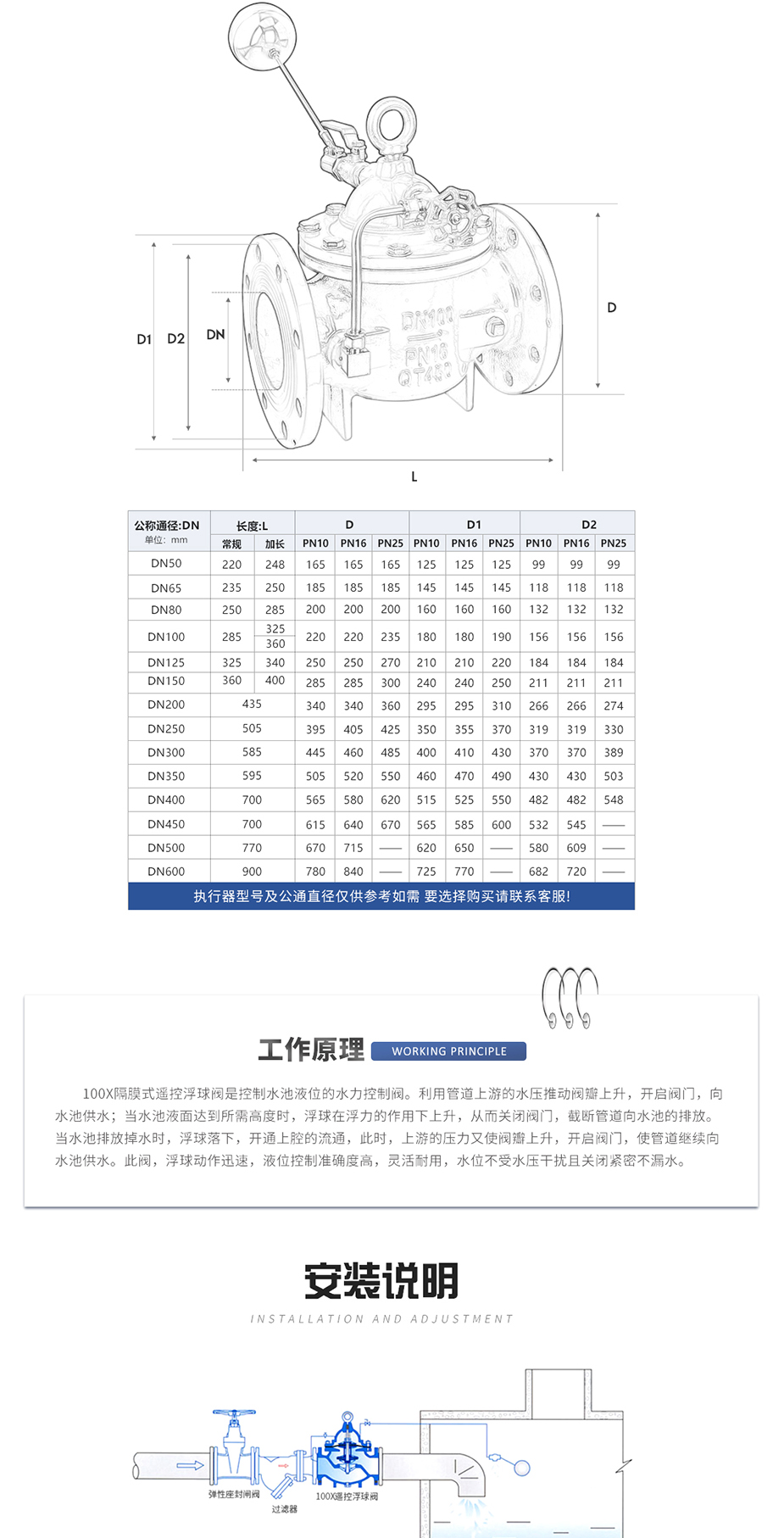 100X遙控浮球閥由主閥、針閥、球閥、浮球閥、微型過濾器等組成水力控制接管系統(tǒng),調(diào)定后,自動控制液面高度。100X遙控浮球閥直接利用液面控制,不需要其它裝置和能源
